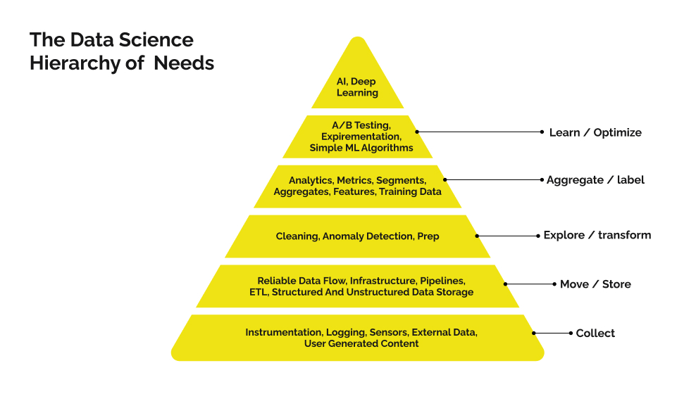 You start with the basics: collecting and storing reliable data. Then you move up through cleaning, labeling, analytics, and only after all that you get to machine learning and AI.