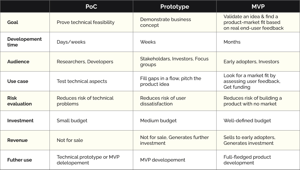 You don’t have to use all three. Some products skip straight to prototyping. Others need a PoC first because the tech is risky. And some go right into MVP mode because the idea is clear and the market timing is right.